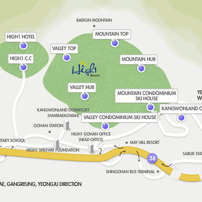 旌善郡、スキー場やゴルフコース、カジノ、さまざまなスタイルの宿泊施設が揃うハイワンリゾート(江原(カンウォン)ランド)内にあるホテルのひとつ。ハイワンカントリークラブを見渡す海抜1100mを超える高地に建つヨーロピアン調の現代的な建物。客室の造りはオンドルルームを含めタイプによって異なるが、それぞれあたたかみのある木製家具とやさしい色調のファブリックでシンプルにまとめられている。館内にはレストランやサウナなどの施設も完備。古汗(コハン)駅から車で約10分。ソウルから車で約3時間。