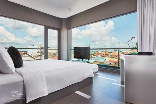 市内中心部、トンレサップ川の近くに位置するホテル。オレンジにライトアップされたフロントデスクはモダンな雰囲気。客室は広めで、オレンジとグレーを基調にしたポップなインテリア。バスルームも機能的で清潔感がある。屋上にはインフィニティプールがあり、プールサイドのオープンエアのバーでは周囲の風景を眺めながら食事が楽しめる。