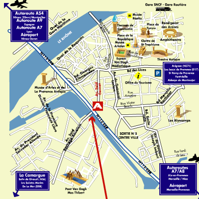 旧市街から少し離れた場所に建つホテル。オレンジ色の大きな建物。フロントは広くゆったりとしており、大きな彫刻やデザイン画が配されているなどギャラリーのような趣がある。客室はシックなプロヴァンス風で天井が高く快適な造り。パティオにあるプールは夏になると天井のガラス窓が開いて気持ちがよい。ローマ・アリーナなどへは徒歩圏内。アルル駅から車で約10分。ニーム・アルル・カマルグ空港から約25km。