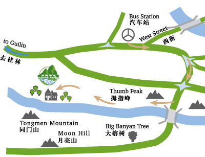 桂林から南へ約70km、陽朔の中心部から約4km、美しい川と山々に囲まれた静かな場所にたたずむリゾート。ゆったりとした庭園内に伝統的な瓦屋根の古風な建物が点在する。客室は、天然素材を使ったナチュラルテイストの洋風インテリアでまとめ明るくさわやかな雰囲気。ハイキングやリバーツアーなどさまざまなアクティビティーも楽しめる。陽朔のバスターミナルから車で約10分。桂林両江国際空港から約98km。